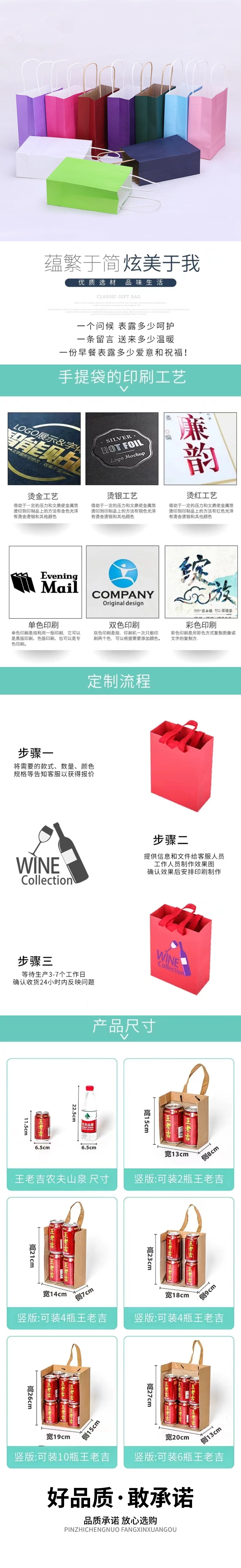 产品特点:1.便携式手提纸袋。采用优质材质,纸袋结实耐用,环保可回收,产品承重力强,容易提拉,且不会勒手。2.精致折边设计精致的折边工艺,边缘没有毛边,更加时尚美观。